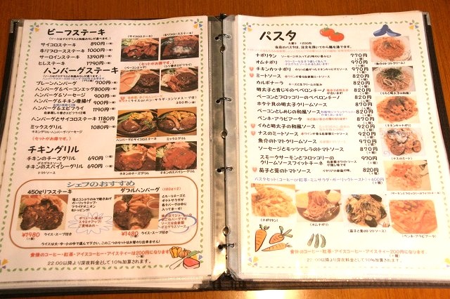 メニューを拝見すれば、モーニングやランチのほかに、レギュラーメニューも様々。ハンバーグやビーフステーキ、パスタ、ピザ、ドリア、グラタンなどの洋食から、定食などの和食、そして丼物、うどん、そば、ラーメンに至るまで幅広いメニュー。さらに喫茶やおつまみ、各種アルコールまで。巷のファミリーレストランよりも幅広いです。