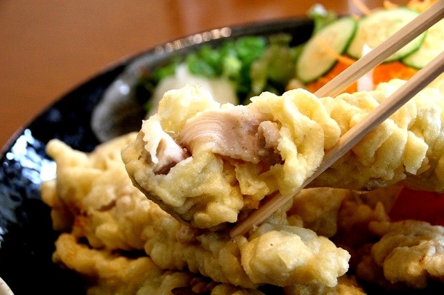 とり天の衣は、ふわっとしたタイプ。これを大根おろしとポン酢でいただきます。
