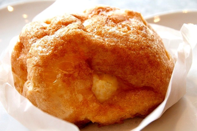 これが、特に凄いです! 最近のシュークリームはオーダー後にクリームを充填する手法に象徴されるごとく、外側ががっしりとしたタイプが話題ですが、それとは一線を画すというか、真逆の、もちもちタイプ。しかも今までに味わった事のない、もちもち感。なんと、おもちを載せて焼いているそう。そんな発想も斬新です。お米の香りも漂います。