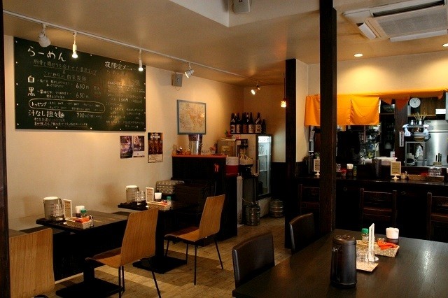 洒落た木のぬくもり漂う店内は、ラーメン店というよりも、カフェレストランというかダイニングバーというか、な雰囲気。築約70年の木造住宅をリフォームなさったそう。