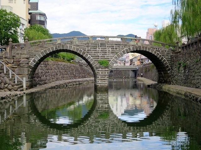 長崎の中島川に架かる眼鏡橋は、観光スポットとしても特に有名です。もともとは寛永11年(1634年)に興福寺の黙子如定禅師が架設したといわれ、日本初のアーチ式石橋でもあります。昭和57年(1982年)には長崎大水害で一部崩壊しましたが、修復され、国の重要文化財にも指定されています。