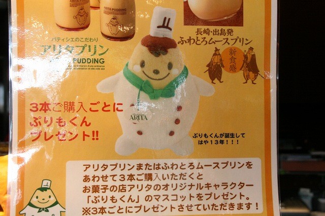 アリタプリンまたはふわとろムースプリンをあわせて3本購入すると、オリジナルキャラクター「ぷりもくん」のマスコットがいただけます。