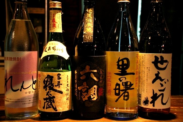 カウンター対面の壁は棚になっていて、アルコールの瓶が陳列されています。やはり奄美ですね。奄美群島全ての蔵の黒糖焼酎を取り揃えています。