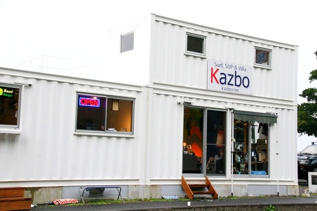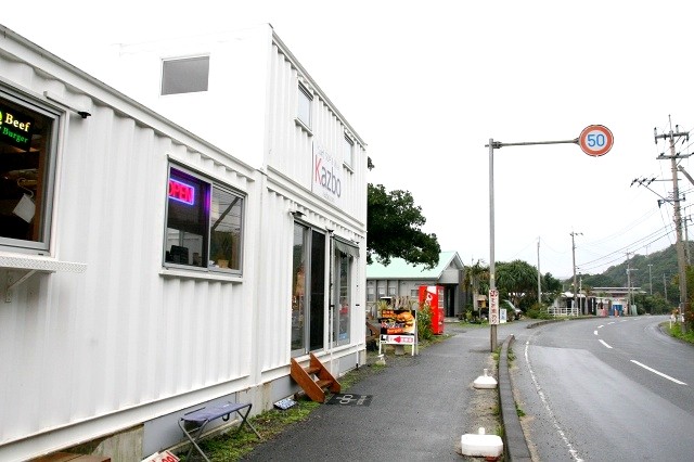 奄美大島空港から名瀬方面に県道82号線をクルマで走ること、約10分。海沿いにリゾートホテル&郷土料理の『ばしゃ山村』が見えてきます。その西隣にあるのが、ホワイトの外観が素敵なコンテナを利用した『Kazboバーガー』です。