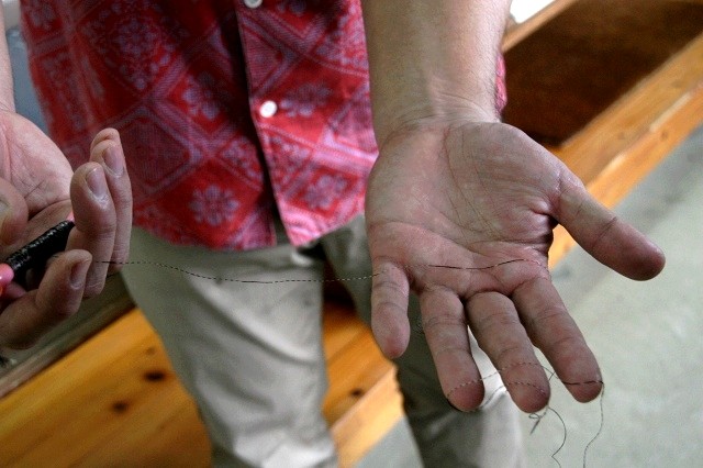 かすり糸を一本一本、完成の模様を考慮して染めていきます。