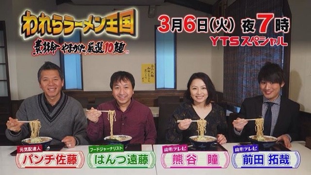 2018年03月04日 【テレビ出演】山形テレビ「われらラーメン王国」 【テレビ出演のお知らせ】 お世話になっております🎵 はんつ遠藤です❗️ 毎回視聴率20%を超える超人気ラーメン番組が今年も放映されます😍 YTS山形テレビ「われらラーメン王国」 素材命 やまがた厳選10麺 2018年3月6日(月)午後7時放送 出演:パンチ佐藤さん、熊谷瞳アナ、前田拓哉アナ、はんつ遠藤 よろしくお願い致します🍀😃✋ 「【TVラジオその他・出演】」カテゴリの最新記事 < 前の記事次の記事 >