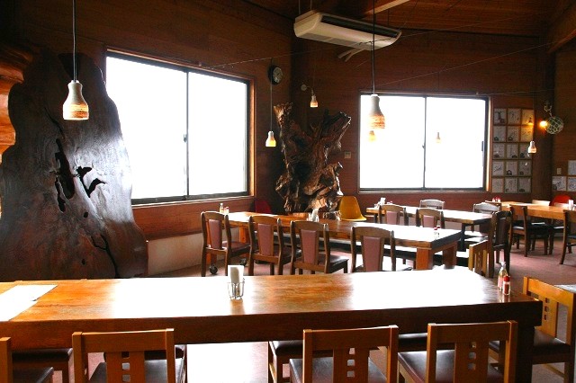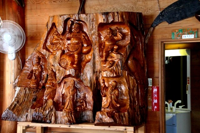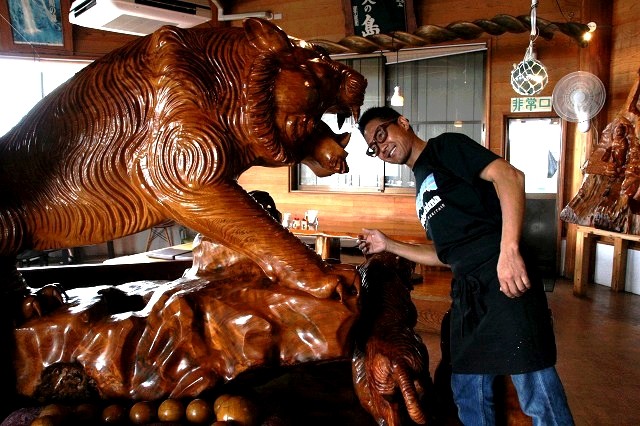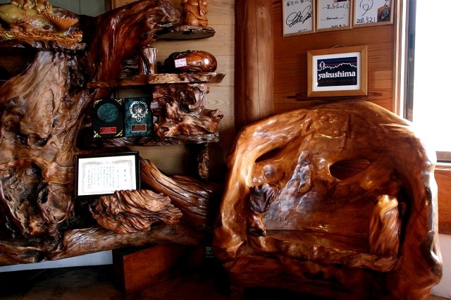 ご主人は池田秀作さん。“七福神”を掘ったタイプに驚いていたら、それは屋久杉の周りを使用したタイプなので、そんなでもなく、むしろ巨木をそのまま用いた“虎”とかはとても貴重なんだとか。あとは、椅子になっているものまで。