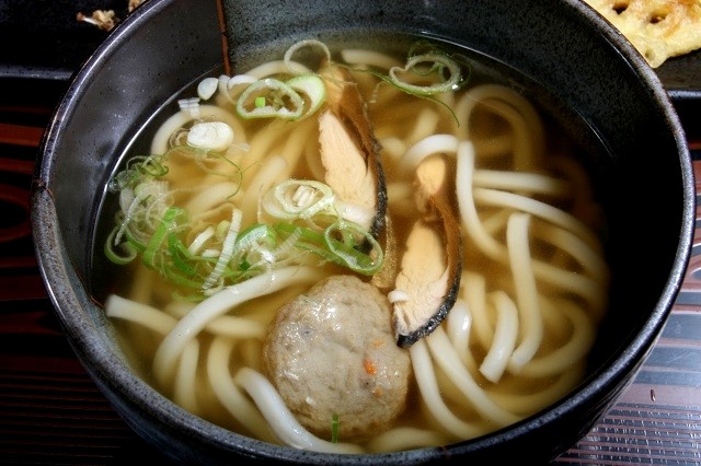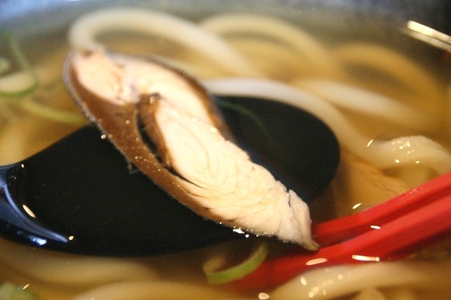 カツオベースの汁で、スモークしたサバ節を“追いガツオ”のように“追いサバ”したツユは、やや濃いめのダシで後を引く美味しさです。