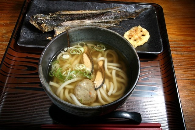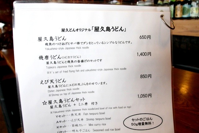 さて、ひととおり堪能した後は、うどんをいただきましょう。とメニューを拝見すれば「飛唐うどん」を発見。うどんと一緒に屋久島で採れる飛魚も味わえるセットタイプですね。というわけでそれをオーダーし、窓の外にひろがる海を眺めたりして待ちます。