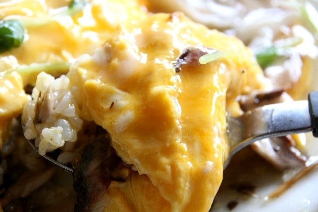 ガーリックライスとサバ節のごはんの上に、とろとろの玉子とサバ節の餡がかかっています。オムライスにサバ節が合うのがびっくり。和ダシのテイストが爽やかにサポート。