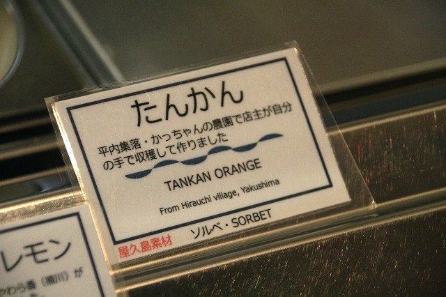 2月くらいに島でできるたんかんを用いたソルベです。果汁にして保存しているそうですが、なんと、収穫も手伝っています。平内集落かっちゃんの農園で減農薬で作られたたんかんを使用。