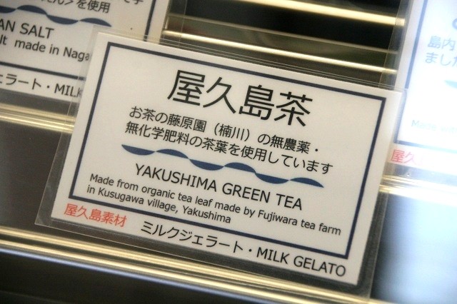 屋久島でもお茶が栽培されています。こちらで使用しているのは藤原園の無農薬、無化学肥料の茶葉。もちろん美味しいですが、真剣さとこだわりも素敵です。ミルクジェラート。