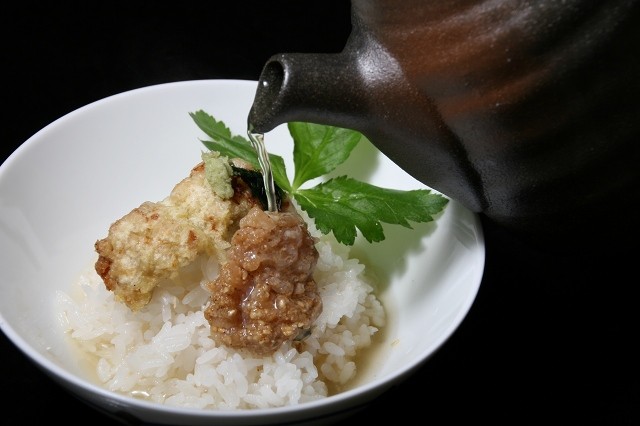 鱧の山椒煮を天ぷらと胡麻油霜和えにし、それをごはんの上に載せて出汁をかけていただきます。