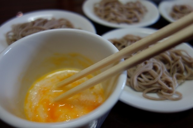『一鶴』でも出石焼きの小皿を使用。5種類の薬味でそれぞれ味わうという言い方をすることもありますが、こちらでは、まずそば猪口に山芋と卵黄、ツユを半分程度入れ、よく溶いた後にそばをつけたり、薬味とともに味わうのがオススメだとか。