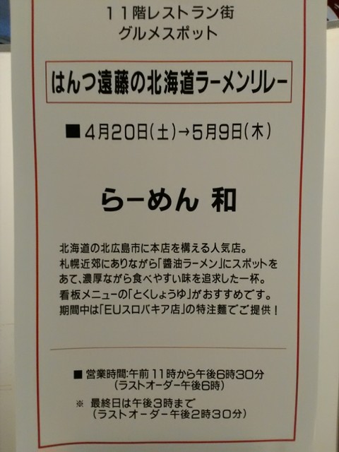 岐阜高島屋に到着!はんつ遠藤の北海道ラーメンリレーも早いもので第6弾。4月20日(土)〜5月9日(木)は北海道北広島市の「らーめん和」(かず)。札幌近郊にありながら「醤油ラーメン」にスポットをあて、濃厚ながら食べやすい味を追求した一杯。オススメは看板メニューでもある「とくしょうゆ」。「らーめん和」はヨーロッパのスロバキアにも店舗があり、西山製麺が直送しています。今回、その麺を使用。日本よりも厳しい審査をクリアしたEU仕様の麺だそう(これは僕もまだいただいてません)。スロバキアから戻ってきた、オーナーである林さん自らが期間中ずっと厨房に入るそうです。スープは北海道の本店で作って冷凍して直送。濃縮じゃないストレートスープです。