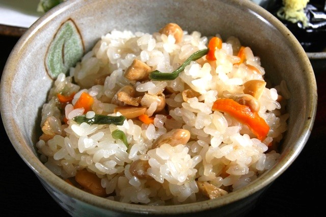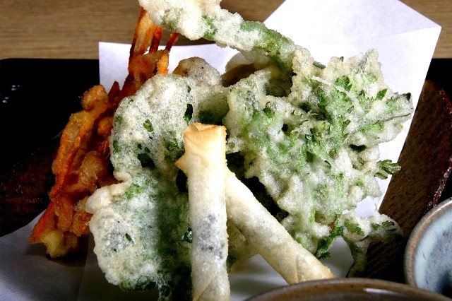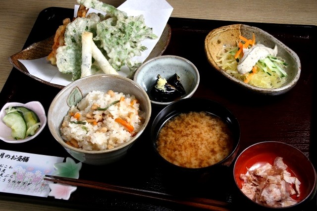 月替わりのおこわ、ミニ雑煮、季節の天ぷら、小鉢、漬物。いわば季節ごとの旬の食材を使った料理です。春には山菜、秋には畑で採れたての野菜が食べられます。そして一年中お雑煮が付くとか。