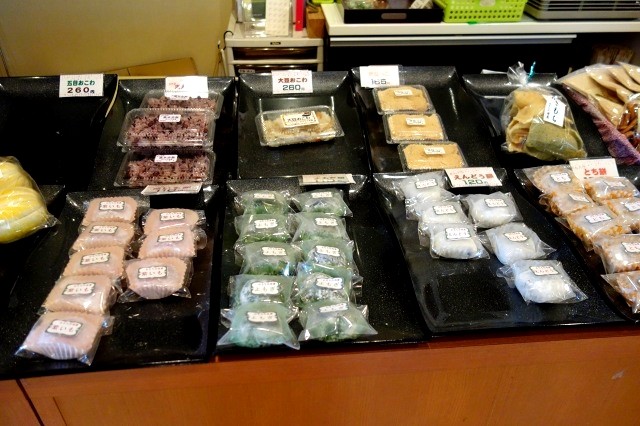 おもちかえりの各種お餅商品も並んでいます。あん入り餅、おこわ、おはぎなどバリエーションもあります。