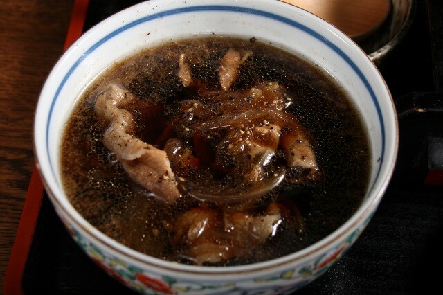 カビ付きのカツオやあらほんカツオ、宗田ガツオも2種類で採ったつけ汁は、醤油の良さと黒豚の脂の甘み、そして刻み玉ねぎでやや甘めな仕上がりですが、黒胡椒で味を締めています。豚肉のジューシーさと玉ねぎの爽快さ、黒胡椒のピリ辛テイストが後をひきます。