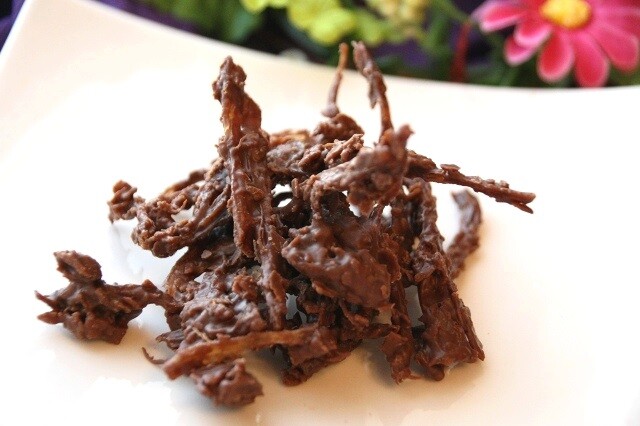 でも、単に“函館こがね”という地元のさきいかとチョコでコーティングしただけと思ったら大間違い。マッチングを研究して行きついたフランス産ミルクチョコを用い、チョコとさきいかの他にフレーク生地も加えることで、ザクザク感が両者のマッチングが成立したという、かなりの努力の結果、生み出された商品なのです。