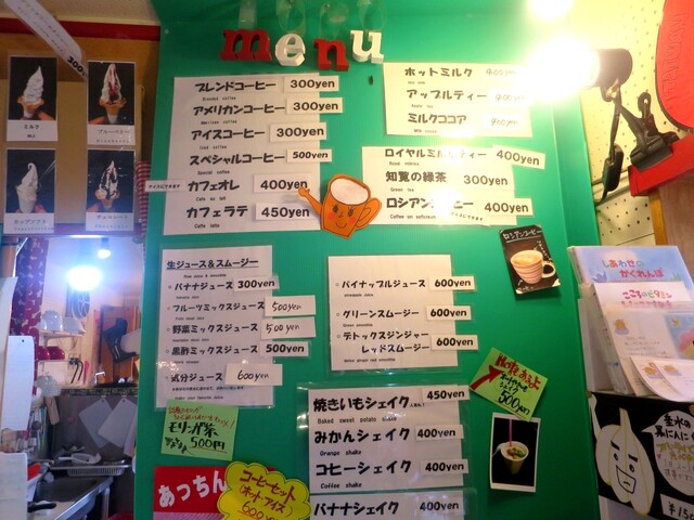 店内に入れば、ずらりと書かれたドリンクメニュー。コーヒー、アップルティーなどのほか、バナナジュースや野菜ミックスジュースなどの生ジュース&スムージーも。