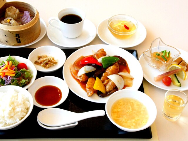 「彩りランチ」くろず酢豚などのメイン料理、デザート、ドリンクが選べる(食前酢、前菜盛り合わせ、サラダ、ごはん、スープ、ザーサイ付き)