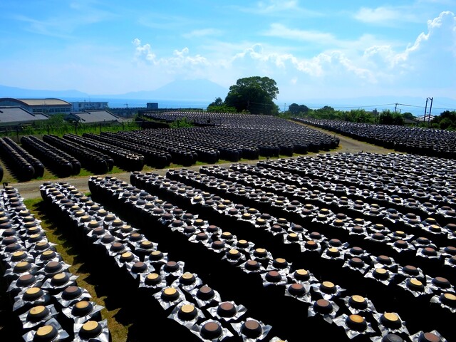 野天の広大な場所には、54L入る壺が合計約52000壺!太陽と微生物の力を借りて、職人の手で育まれ、1年以上じっくり時間をかけて生まれるそう。