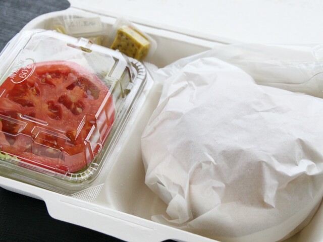 バンズにパテは挟まっているものの、レタスやトマトなどの野菜は別添えになっています。それを自ら重ね合わせるという珍しきタイプ。