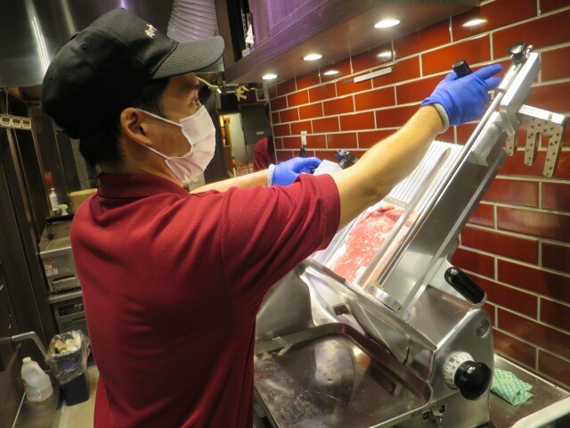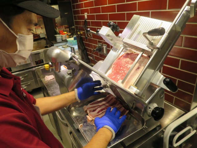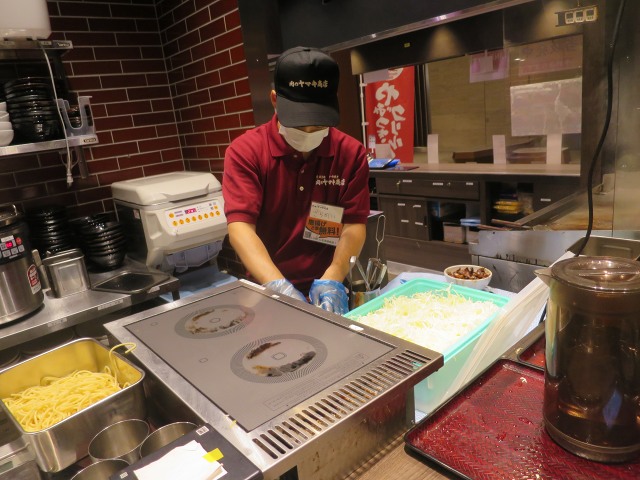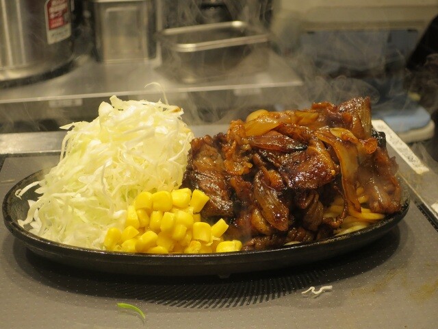 鉄板に焼かれた牛カルビとキャベツ、とうもろこし、パスタを載せ、専用の機械に載せ、