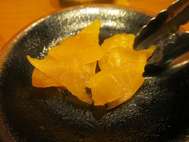 やや硬め。醤油ベースに豆板醤とか唐辛子、胡椒などが合わさったタレで味付けされているので、このままでも甘じょっぱくて美味です。