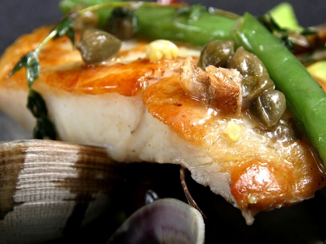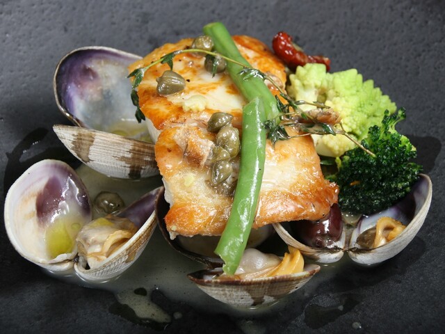 留萌産ヒラメと厚岸あさりと地元野菜のブレゼ2200円(税別)