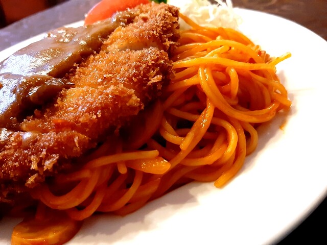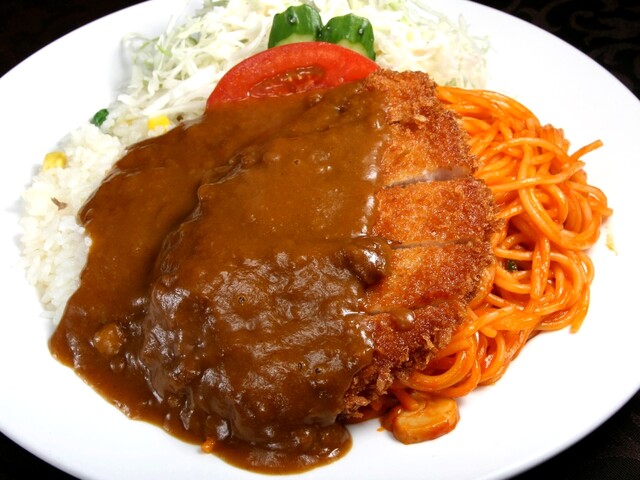 植物油使用ポークカツにカレールゥ、最高級マーガリンのバターライス、スパゲティーが一体化