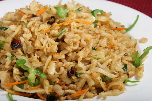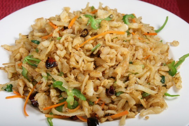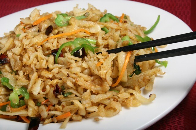 擦子(細切り状におろす道具)を使い、細切りにしたジャガイモに小麦粉をまぶし蒸した後、水を使わず高温で炒めた家庭麺料理です。