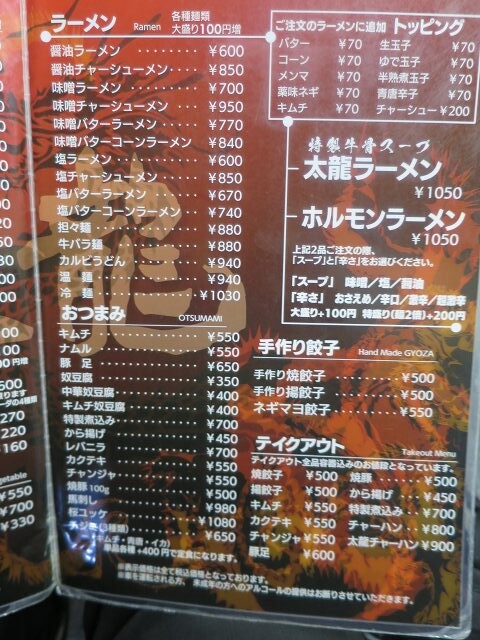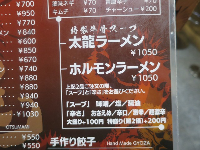 根強い人気の特製牛骨スープが決め手で太麺使用の「太龍ラーメン」は、スープ(味噌、塩、醤油)と辛さ(おさえめ〜超激辛)から選べます。