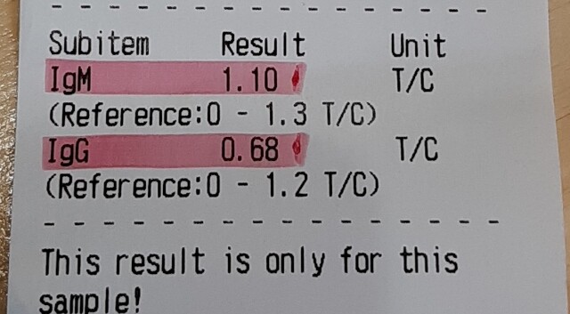 ²áµî¤ò¬Äꤹ¤ë¹³Âθ¡ººIgM¤¬1.3°Ê²¼(ËͤÏ1.10)¡¢IgG¤¬1.2°Ê²¼(ËͤÏ0.68)¤Ê¤é´¶À÷¤Î²ÄǽÀ¤¬Ä㤤