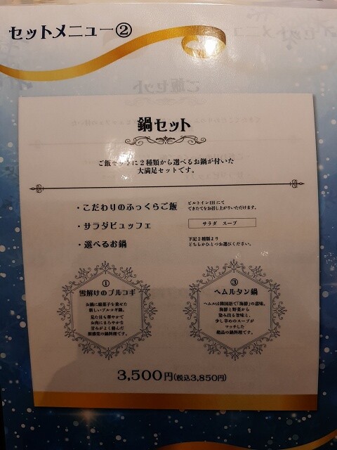 料理は「ヘルムタン鍋」のセット3,850円を。