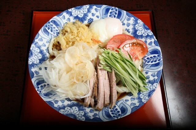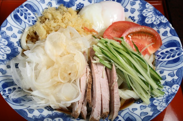 チャーシューやあげ玉、温玉、自家栽培主体の野菜たっぷりの「冷やしたぬきうどん」が、夏の定番。