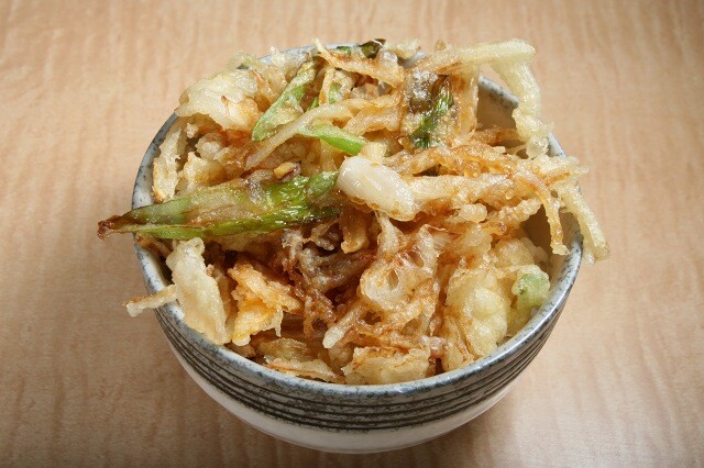 写真は、肉ねぎ汁 並2玉、と、ミニかき揚げ丼