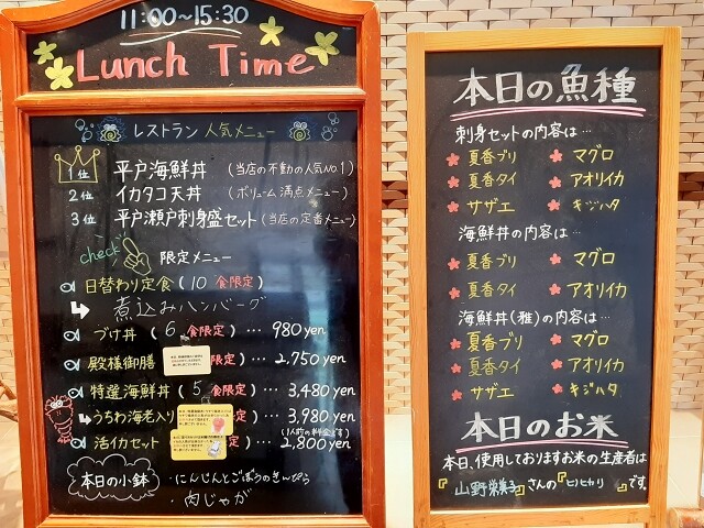 レストランのランチタイム人気メニューベスト3は「平戸海鮮丼」「イカタコ天丼」「平戸瀬戸刺身盛りセット」だそう。