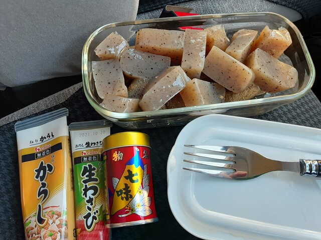 (車内で、おうちで切って来たこんにゃくを食べ続けるのって、なんかシュールだ。。。)