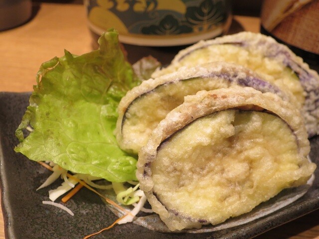 なすで餃子の餡を包み、天ぷらにした創作料理