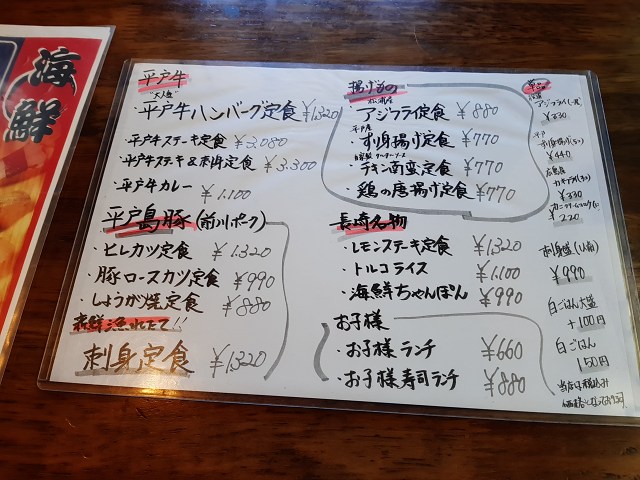 創業以来30余年。平戸牛ハンバーグ定食や地魚海鮮丼、寿司、海鮮ちゃんぽんなど幅広きメニューがあって大評判です。