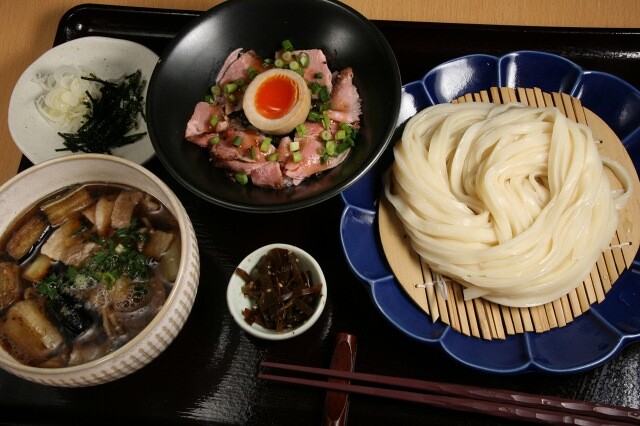 特に人気は、「肉汁うどん(ごまだれうどんなども選択可)&ローストポーク丼」