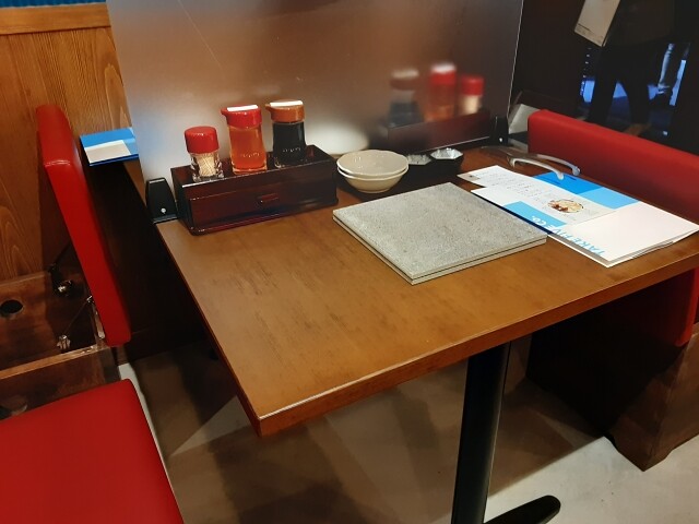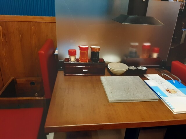 卓上の白いあっさりダレでお好みの辛さに調節できます。
