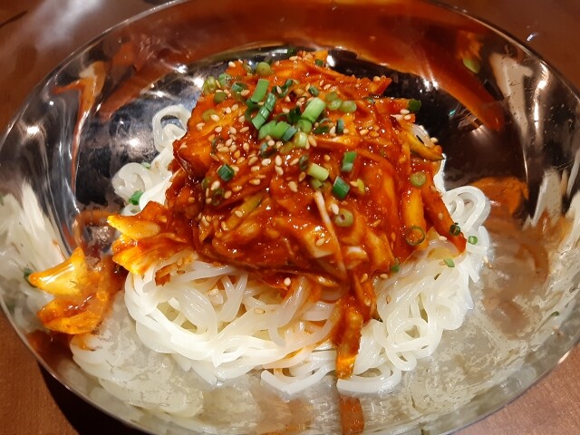 スープのない冷麵。特製辛味噌アンコで仕上げた激辛タイプ。