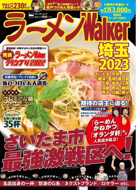 2022年12月25日 【監修】ラーメンWalker埼玉2023 お世話になっております。フードジャーナリストの、はんつ遠藤です! 「ラーメンWalker埼玉2023」が発売されてました。 900円(税別) 僕も総合部門や新店部門、殿堂店のお取り寄せ麺などで協力や登場してます♪ 無料試食券&半額クーポンなど、約13,000円相当のクーポン付き!! 超お得だー。 よろしくです❗️ 「【雑誌Web・執筆】」カテゴリの最新記事 < 前の記事次の記事 >