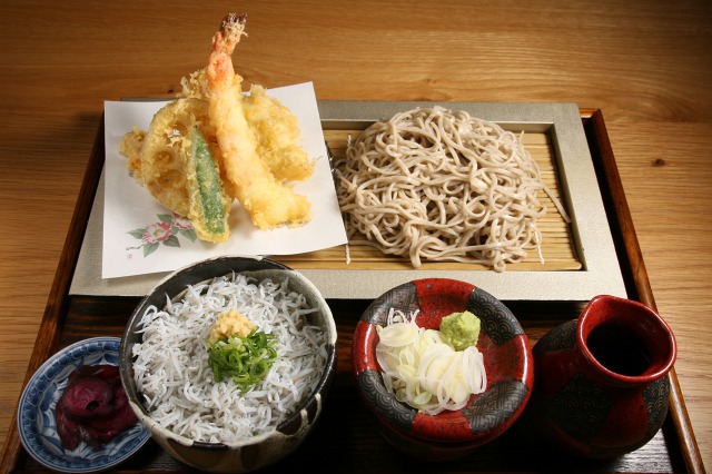 いただいたのは「ざる」と「釜揚げしらす丼」と「天ぷら盛り合わせ五品」