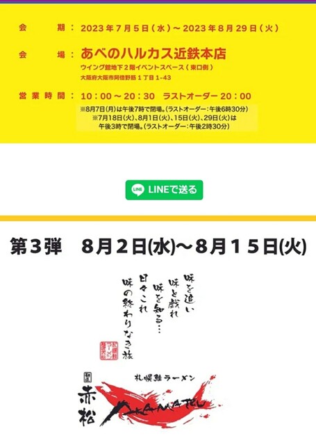 2023年08月02日 【イベント】大阪・あべのハルカスラーメンリレー第3弾:北海道・札幌「札幌鮭ラーメン 麺匠 赤松」 お世話になっております。 フードジャーナリストの、はんつ遠藤です! 大阪・あべのハルカスラーメンリレー、2か月間限定開催中。 第3 弾は8/2(水)〜8/15(火)、北海道・札幌「札幌鮭ラーメン 麺匠 赤松」 10:30〜20:30(20:00L.O) 8月7日(月)は19:00で閉場(18:30L.O) 8月15日(火)は15:00で閉場(14:30L.O) よろしくお願いいたします❗️ 「イベント」カテゴリの最新記事 < 前の記事次の記事 >