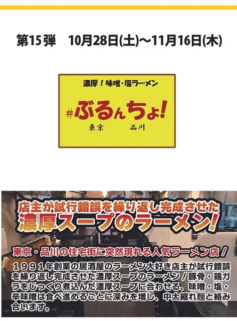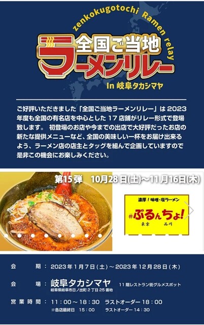 2023年10月27日 【イベント】岐阜高島屋2023全国ご当地ラーメンリレー第15弾:東京品川「#ぶるんちょ!」 お世話になっております。 フードジャーナリストの、はんつ遠藤です! 岐阜高島屋「全国ご当地ラーメンリレー」は2023年も開催!! 第15弾は10/28(土)〜11/16(木)、東京品川「#ぶるんちょ!」 11:00〜18:30(18:00L.O) (最終日は11:00〜15:00(14:30L.O)) 新潟伊勢丹ラーメンリレーも7/26から開催中💙 よろしくお願い致します😍 「イベント」カテゴリの最新記事 < 前の記事次の記事 >