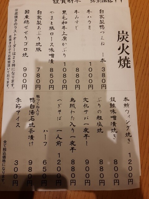 各種炭火焼や鴨しゃぶ鍋、鰤しゃぶ鍋ほか