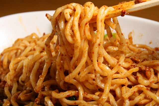 太麺タイプで、混ぜるほどに辛さと痺れが一体化。